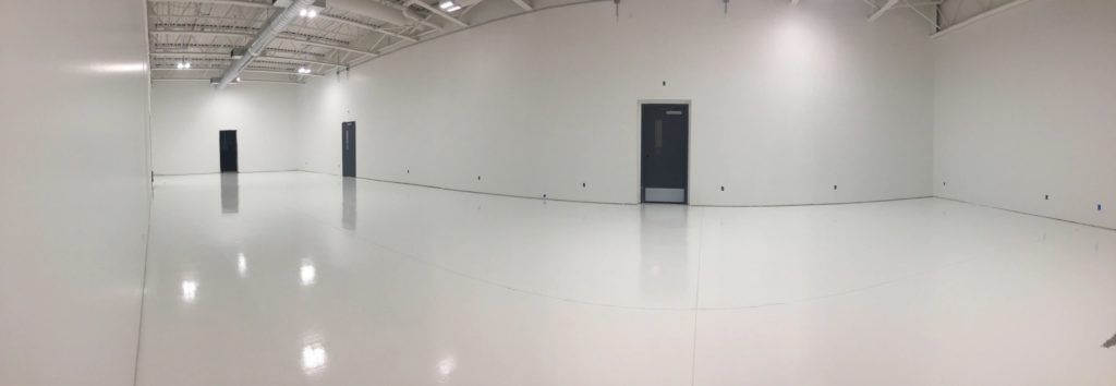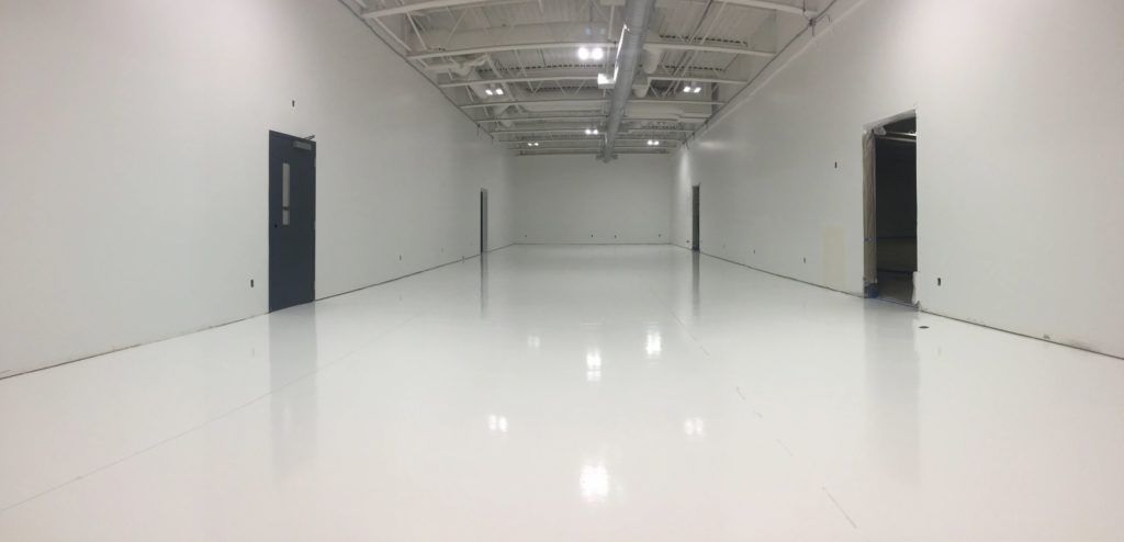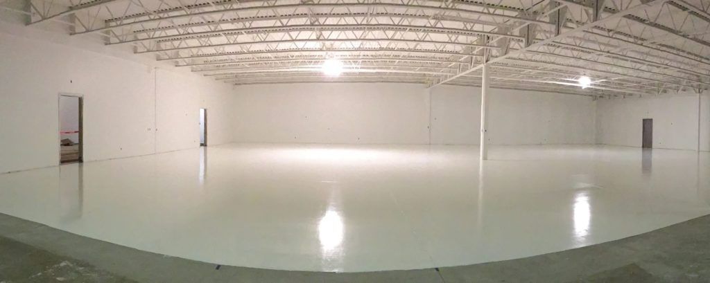Prep: We grind about 1/32nd of an inch off the entire floor. This opens up the pores of the concrete and adds little bumps to it that we call “profile”. This lets our Epoxy Primer seep down into the concrete before it hardens and the profile also gives it something to stick too. Never accept acid etching as a way to prep concrete, it just doesn’t work.